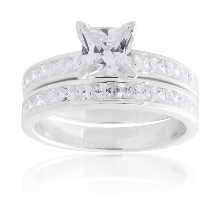 A classic bridal set that is truly timeless. Including both a wedding and engagement ring that fit effortlessly together. The engagement ring features a princess cut engagement ring that has brilliant facets and amazing sparkle. The corners of the square stone are protected by silver metal, making the ring especially great for everyday wear. The band of both rings are paved with the glitter of sparkling stones that are embedded in the silver.