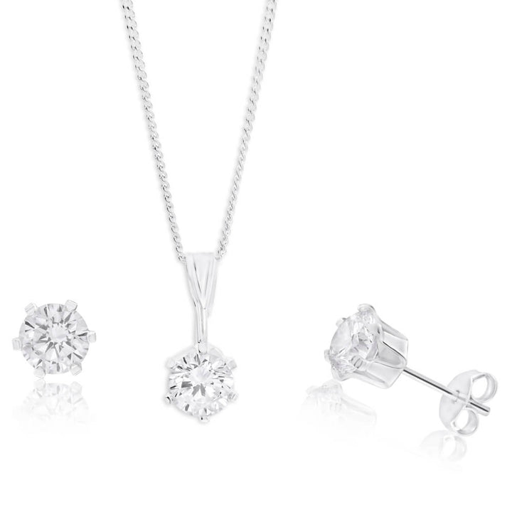 Sterling Silver 6mm Zirconia Pendant and Earring Set with Chain