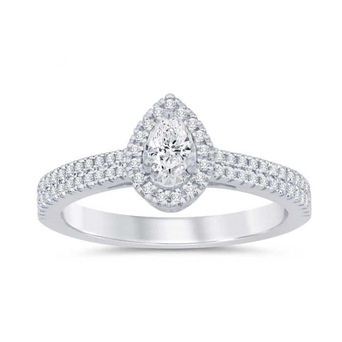 9ct White Gold 1 Carat Pear Cut Diamond Solitaire Ring with Brilliant Halo and Sides