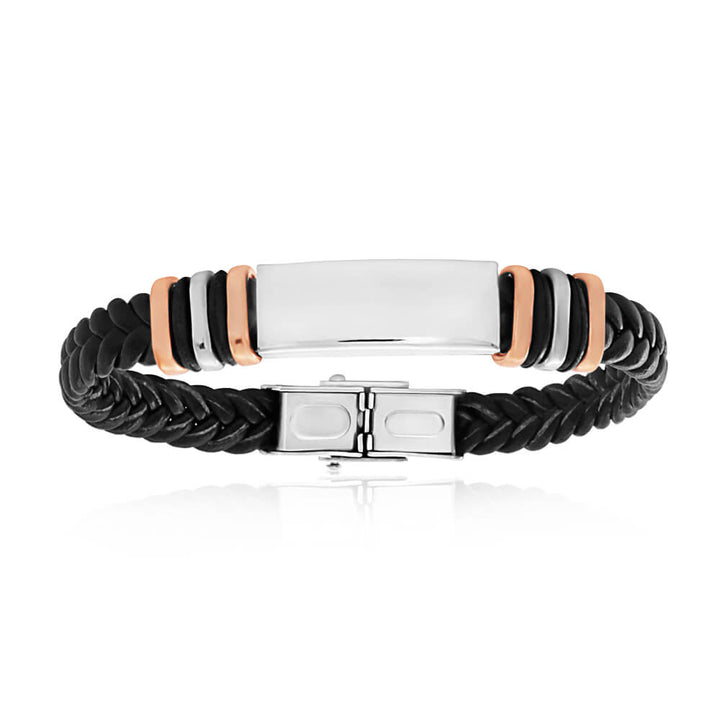 With a stylish plaited black leather bracelet, this 19.5cm bracelet features a stainless steel clasp and plate, and rose gold-coloured accents.… read more