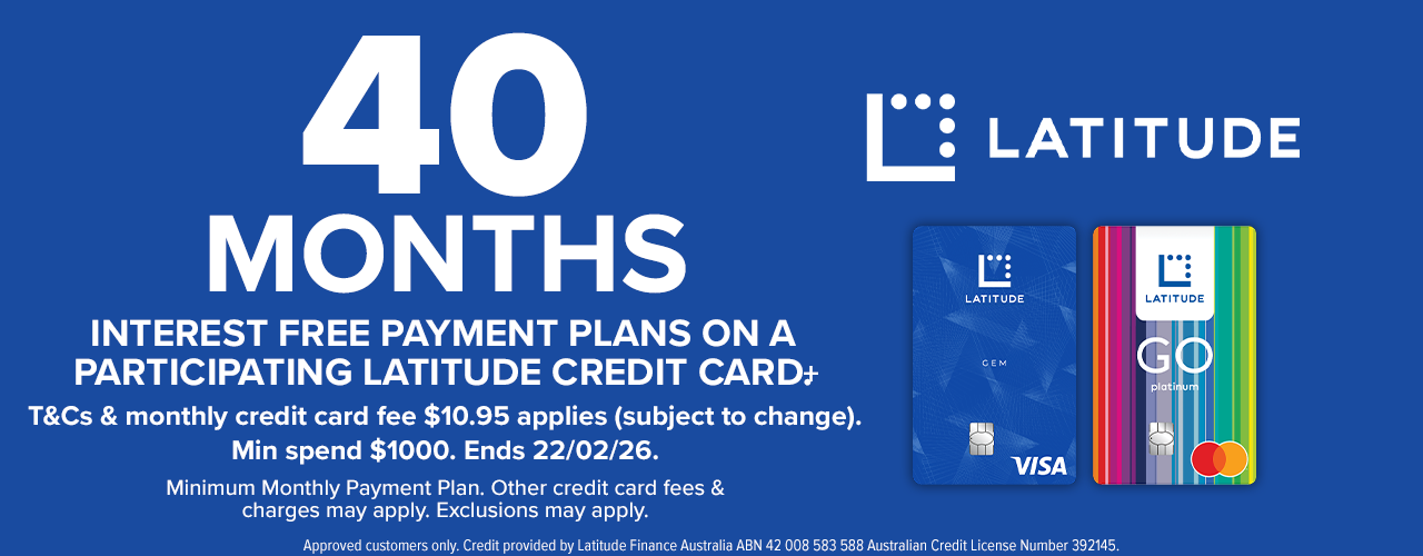 Approved customers only using a Minimum Monthly Payment Plan. Monthly credit card fee applies, currently $10.95 (subject to change). Paying only the minimum monthly payments will not pay out the plan. After the interest free plan ends interest will be charged on any outstanding balance at the expired plan rate, currently 29.99% p.a. (subject to change). If you miss a payment, late fees will apply and interest may apply. Interest may also be charged on other purchases and transactions made on your Latitude credit card. Latitude Credit Card General Terms and Conditions set out the T&Cs for the Latitude Gem Visa credit card. Credit provided by Latitude Finance Australia ABN 42 008 583 588. Australian Credit Licence number 392145.