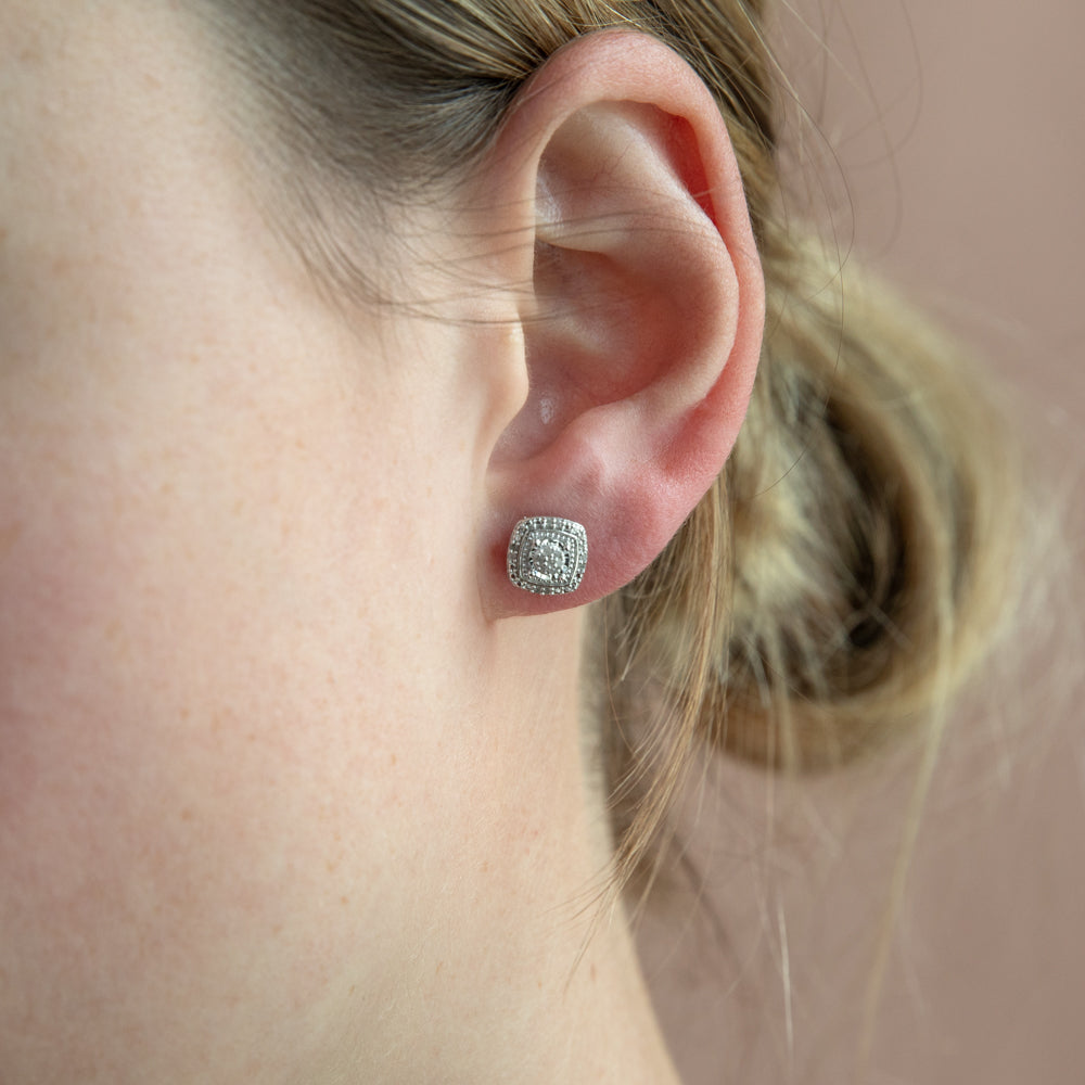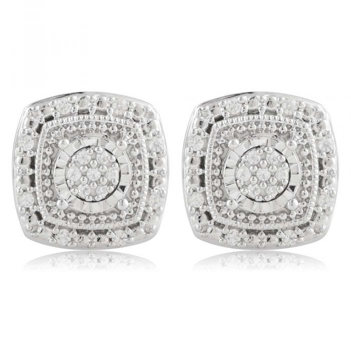 These 0.10 carat diamond stud earrings bring serious sparkle in sterling silver. Featuring 30 brilliant-cut diamonds that catch the light from every angle, they're a gorgeous way to add some shine to your everyday look. The cushion-shaped design gives a touch of vintage glamour that works with everything from work outfits to weekend styles.