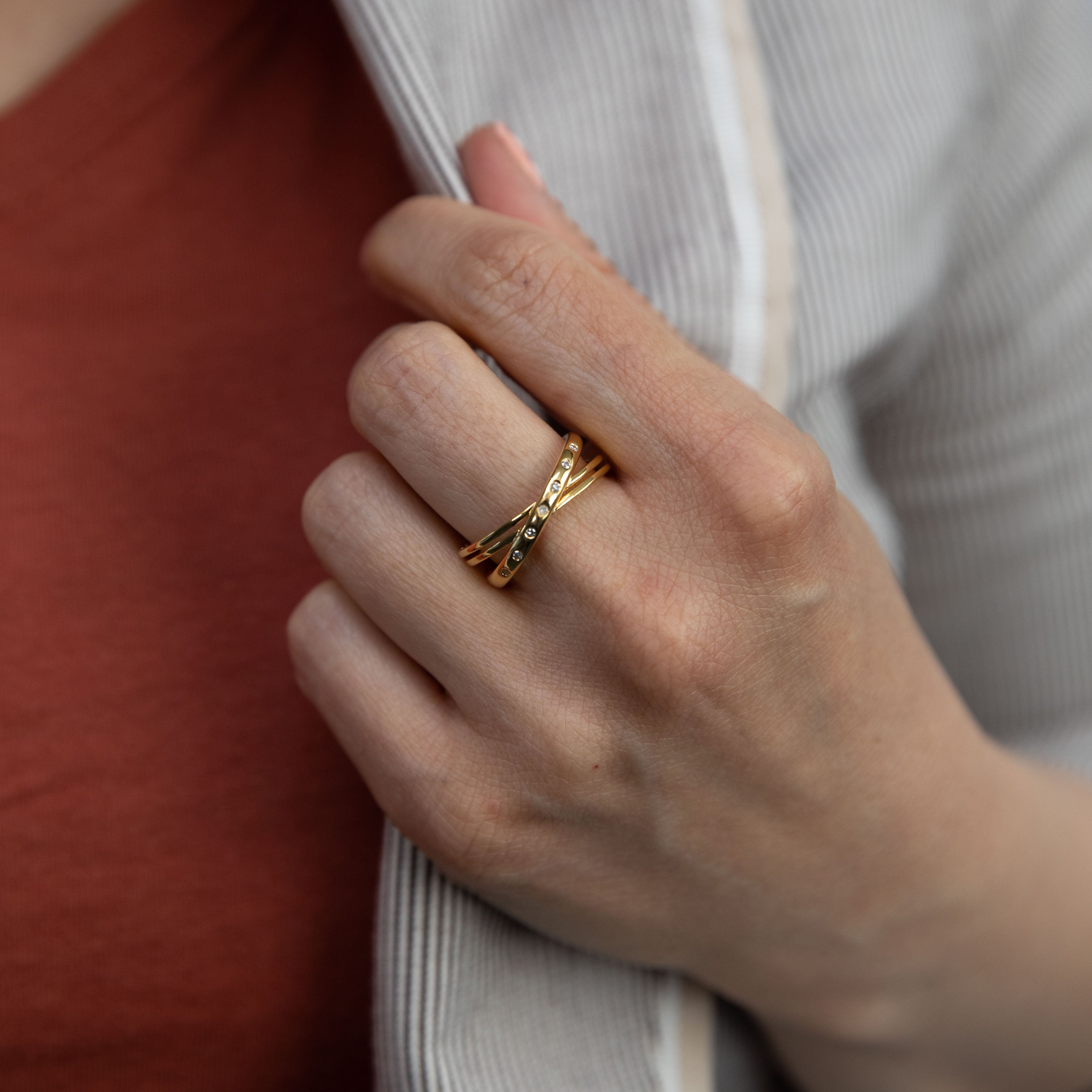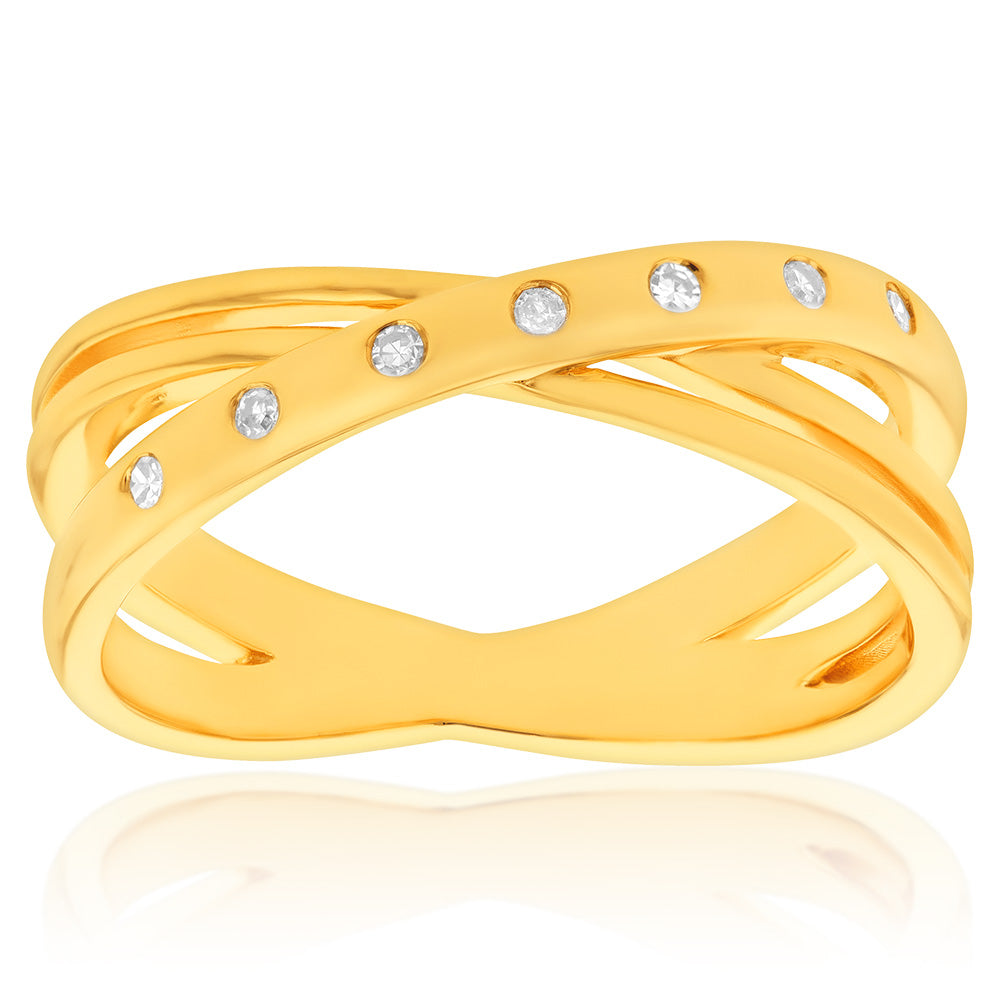 14ct Gold Plated Sterling Silver Diamond Cross Over Ring with 7 Diamonds