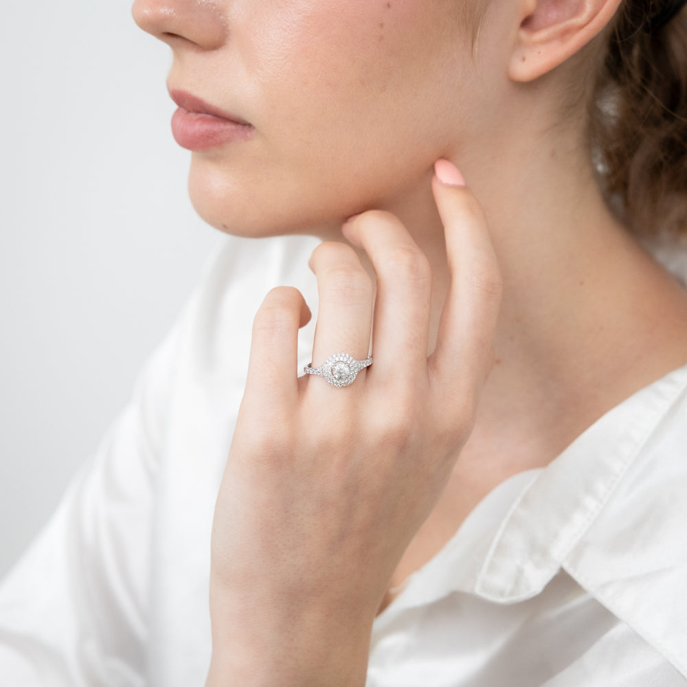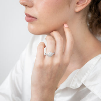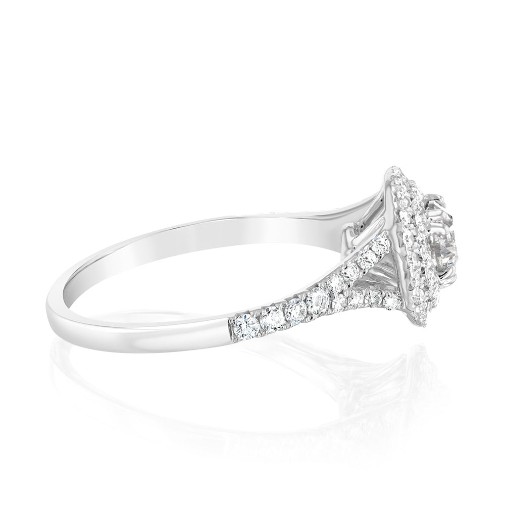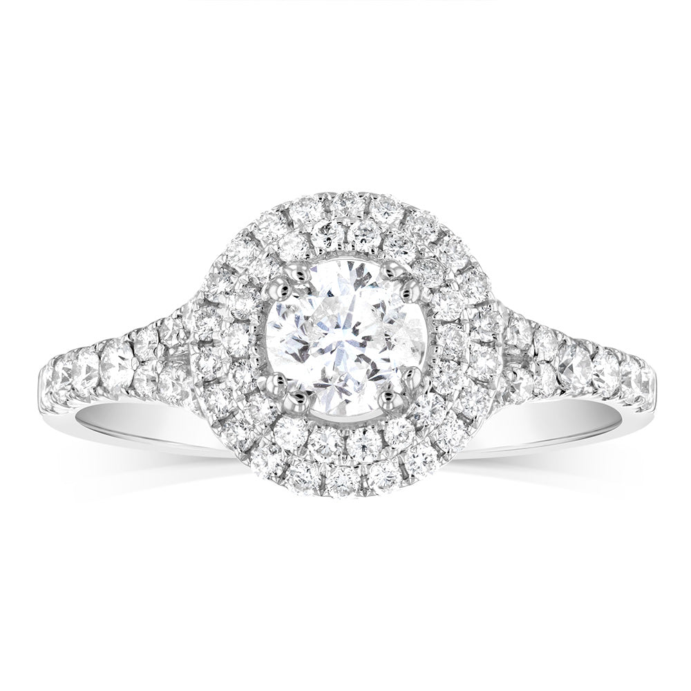 14ct White Gold 1 Carat Brilliant Cut Diamond Solitaire Ring with Double Diamond Halo and Diamond Split Shank