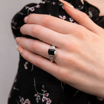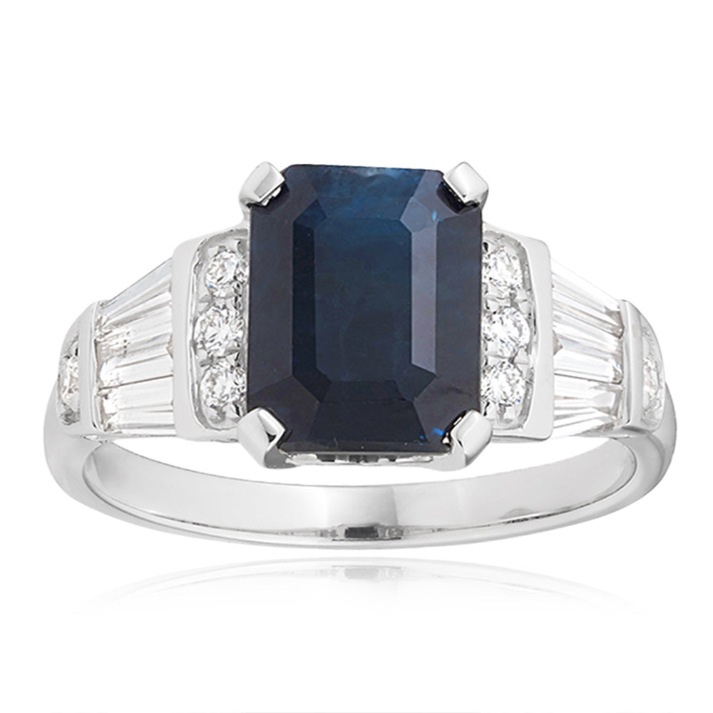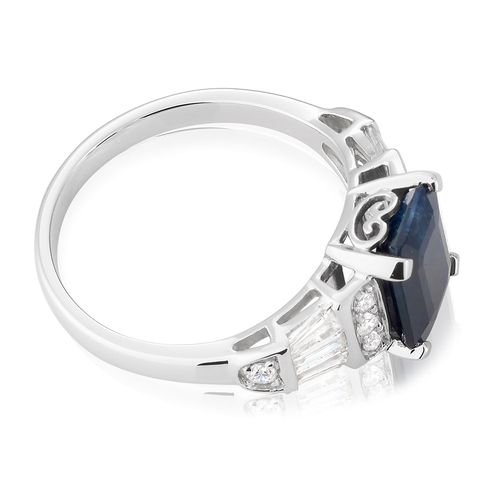 18ct White Gold Natural Black Sapphire 3.00ct Emerald Cut Ring with 0.50ct Diamonds