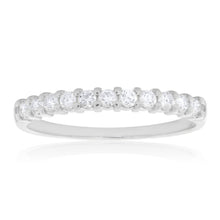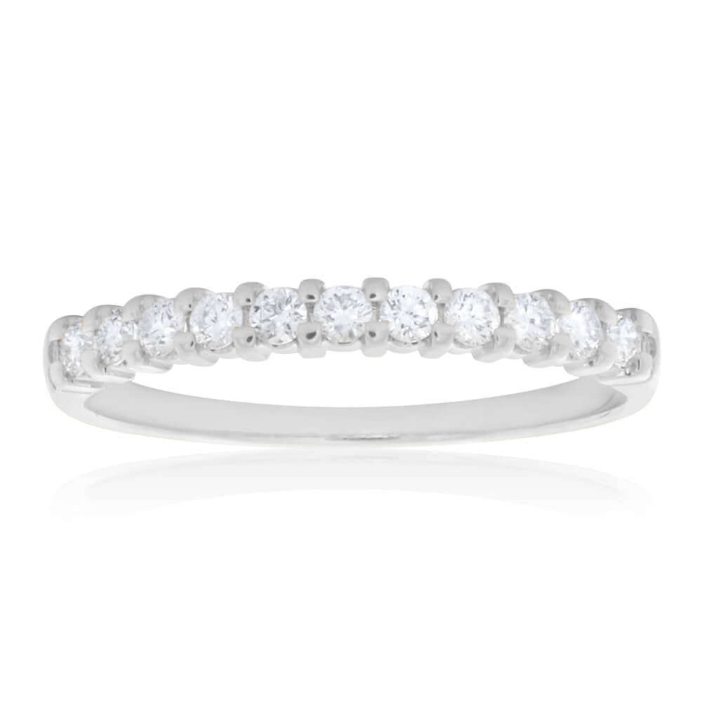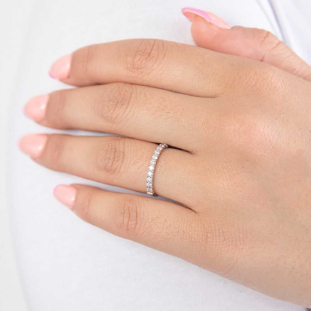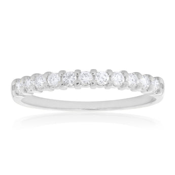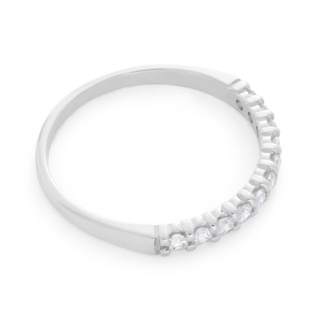 This 18ct White Gold Ring With 0.25 Carats Of Diamonds is graceful and feminine, with a shimmering strip of diamonds on its front. These brilliant cut diamonds add an icy glimmer to the pristine tones of the 18ct white gold. This crisp, simple design is perfect for any big occasion with its understated luxury. The smooth band is always-comfortable and constantly catching glances with its memorable white gleam.