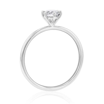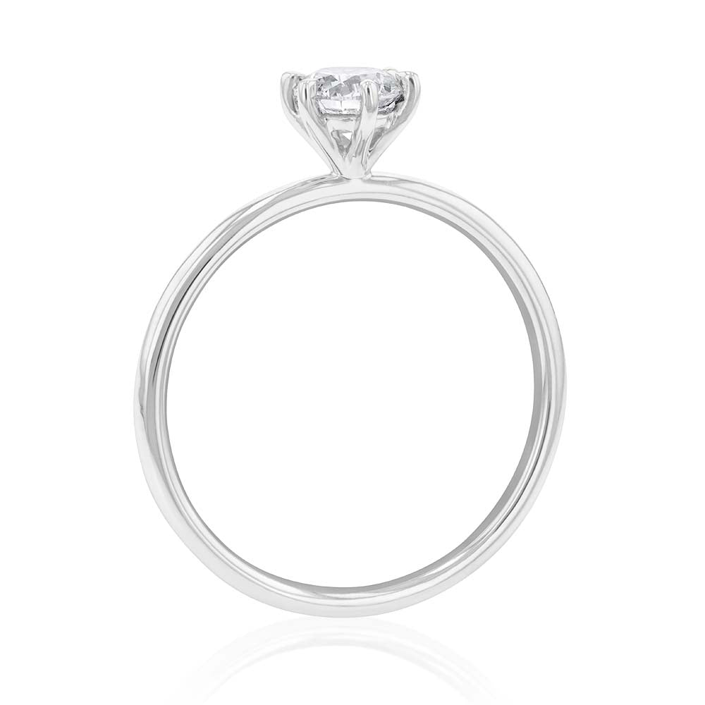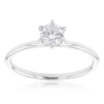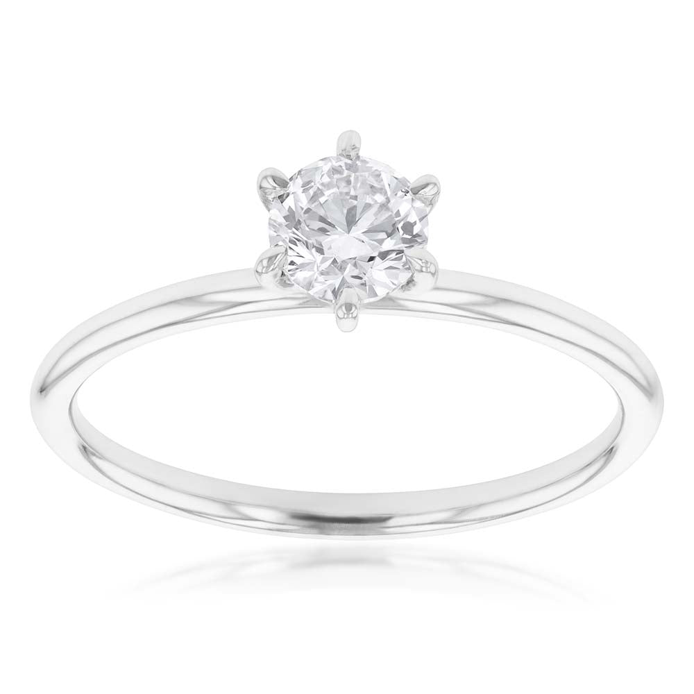 Made from high-quality white gold, this exquisite ring holds at its heart a brilliant 0.5-carat diamond. The white gold band is sleek, slender and flawlessly polished to ensure a comfortable fit and complement the diamond. A strong and delicate prong setting holds the diamond in pace, allowing ample light to pass through and enhance its natural sparkle.