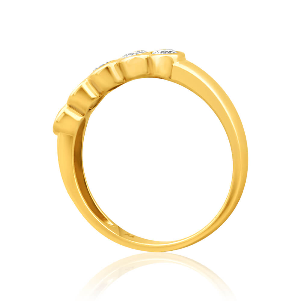 Feel adored in this 18ct Yellow Gold Ring With 0.5 Carats Of Bezel Set Diamonds. This piece is made from the finest quality 18ct yellow gold, and features a refined design with rows of bezel set diamonds. Each diamond is cut to perfection, and made even-more beautiful in their lush golden bezels. This ring will shimmer and glow under any kind of light for an unforgettable look.