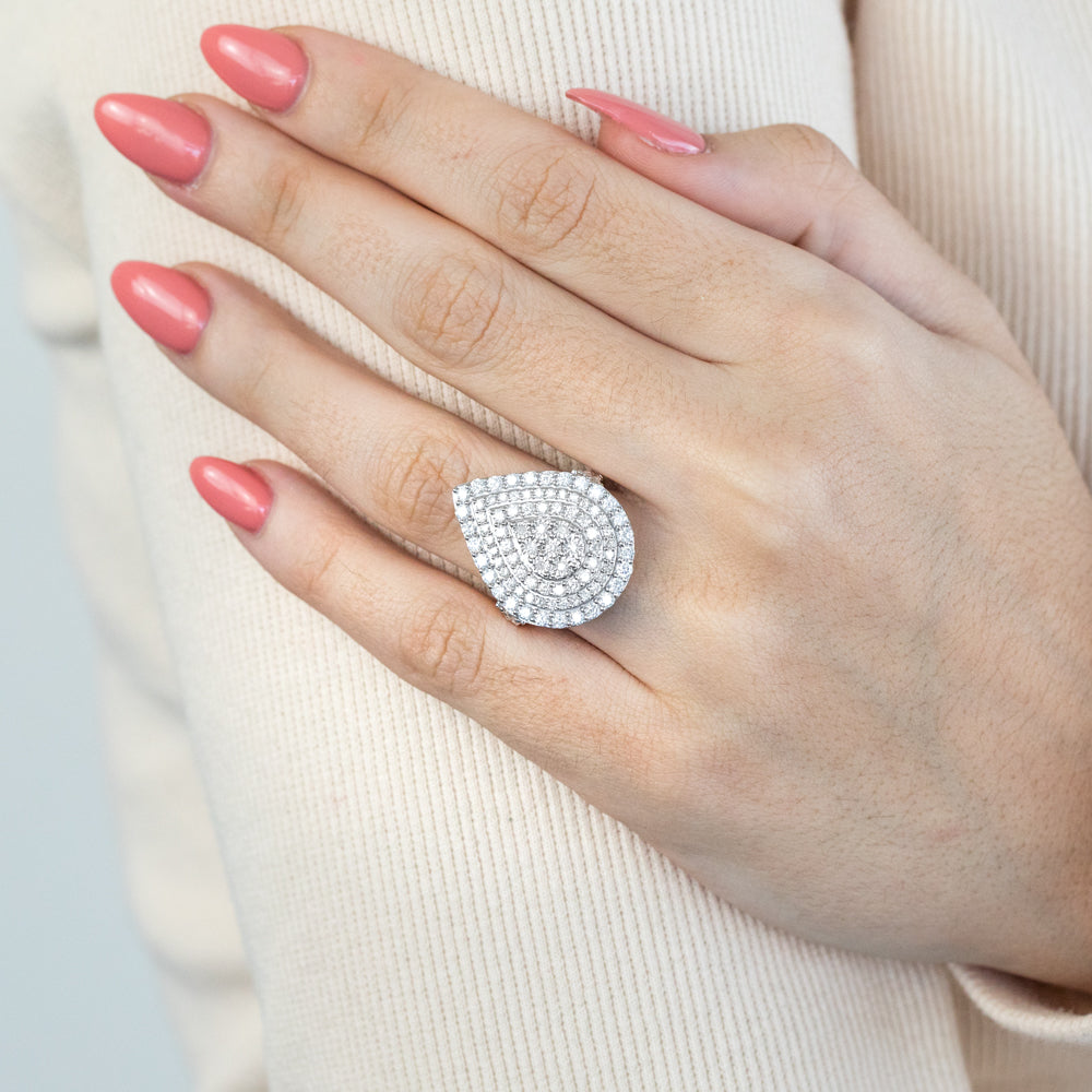 This fancy-looking pear-shaped ring will instantly add brilliance and sparkle to every ensemble. Tapered on one end and covered from the other, this ring is sure to enhance the beauty of any outfit by adding a touch of sparkle to it.