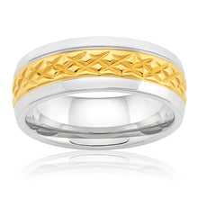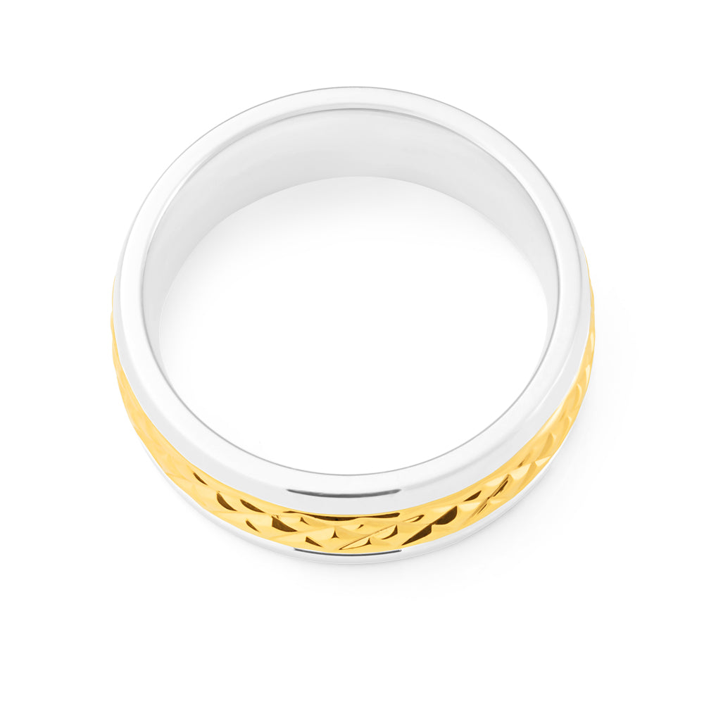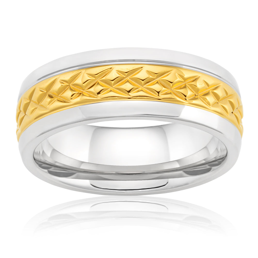 8mm Stainless Steel and Gold Plated Patterned Gents Ring