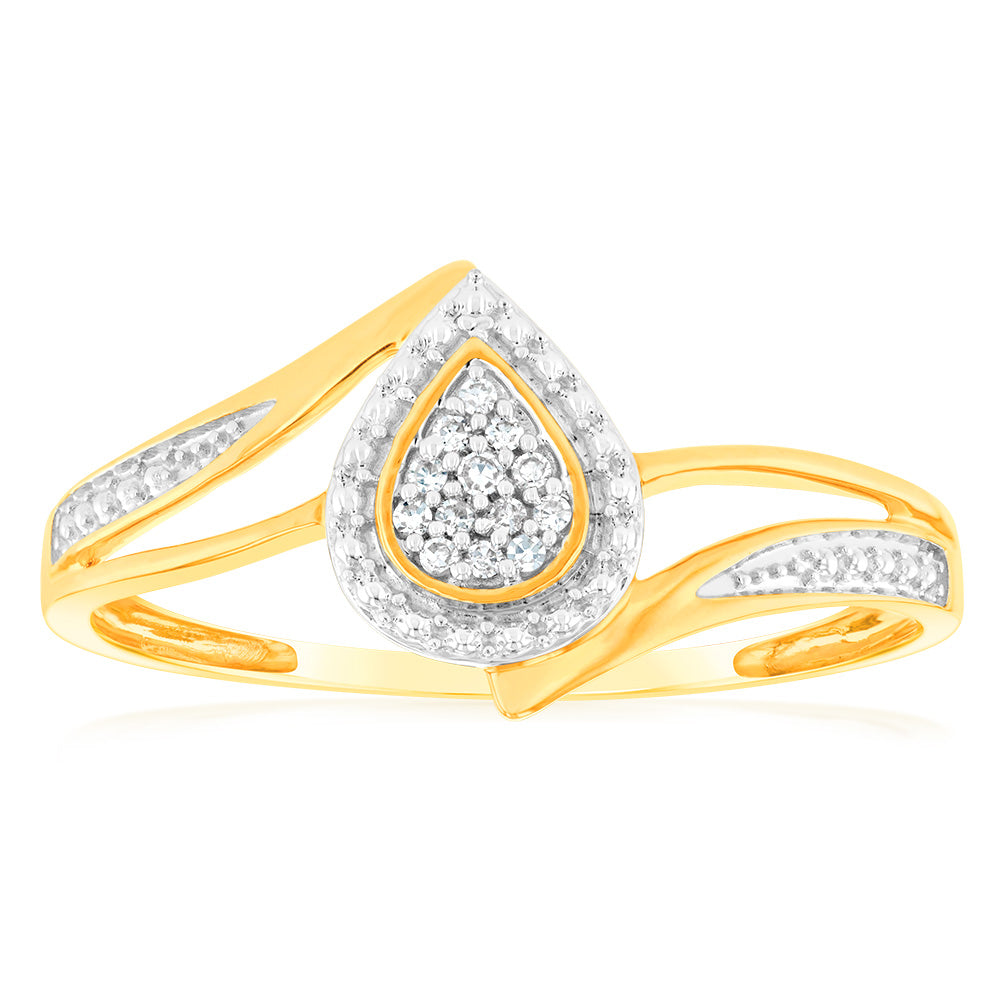 Providing exquisite craftsmanship, this 9ct charming yellow gold diamond ring is designed for women who love getting their sparkle on. This gorgeous 9ct yellow gold ring features an undulated ribbon of shining diamonds touching a pear-shaped centrepiece with big diamonds dotted all over it. Crafted to make the wearer feel special, this piece represents the beauty of gold and brilliant-cut diamonds.