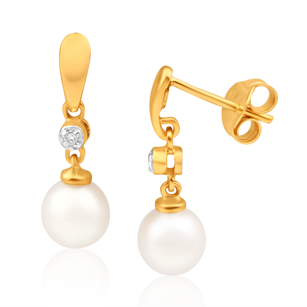 9ct Charming Yellow Gold Diamond + Pearl Drop Earrings
