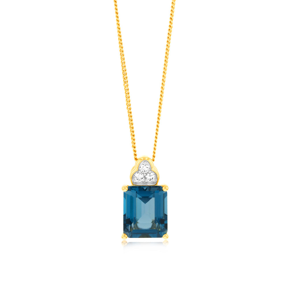 9ct Gold 5.6ct London Blue Topaz in Emerald Cut and 1/10 Carat Diamond Pendant