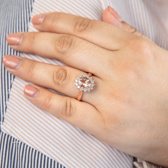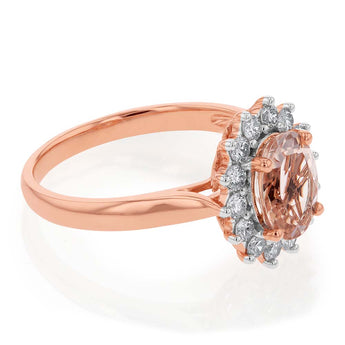 9ct Rose Gold 1.50ct Morganite and 0.50ct Diamond Halo Ring