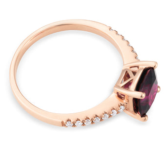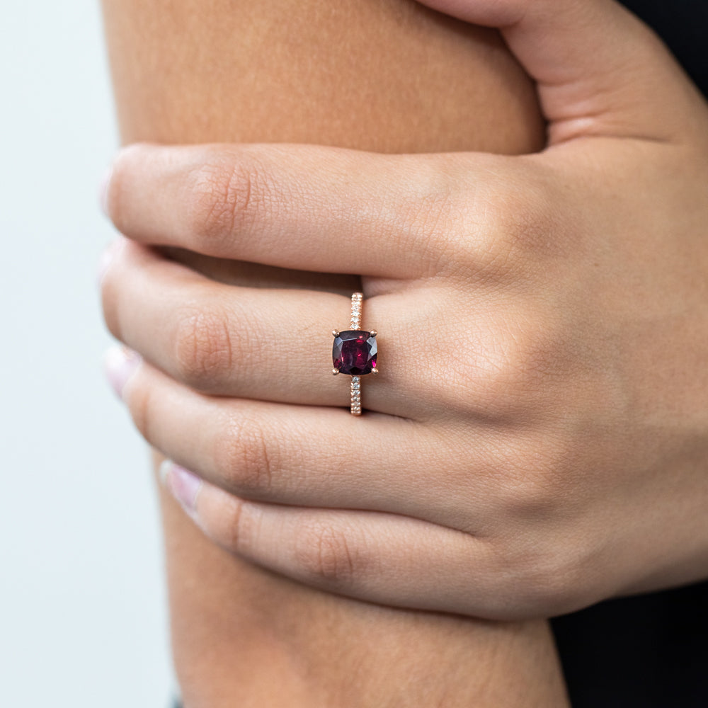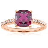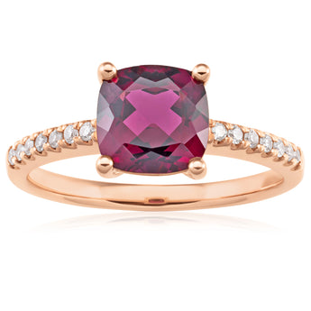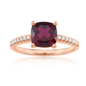 9ct Rose Gold 7mm Cushion Cut Rhodolite Garnet Ring with 0.11ct Diamonds