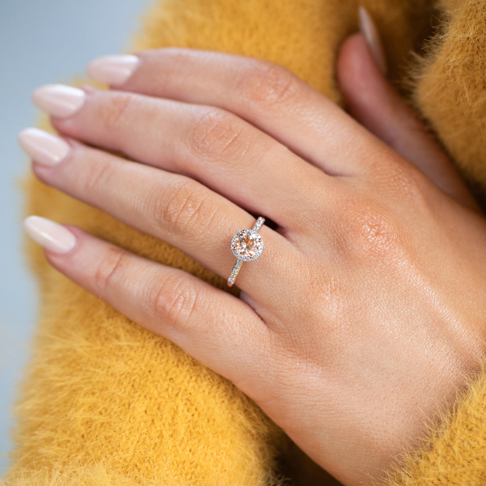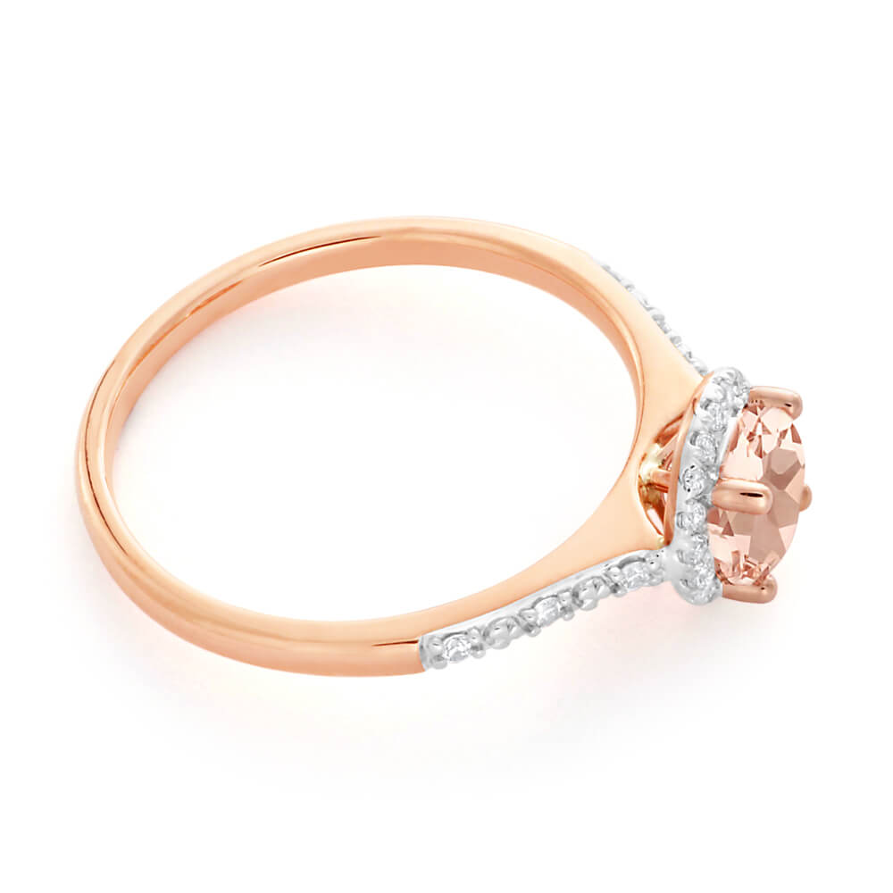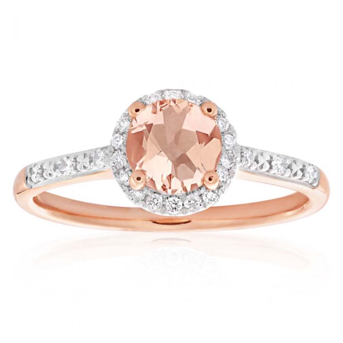9ct Rose Gold 0.8ct Morganite and 0.10 Carat Diamond Halo Ring