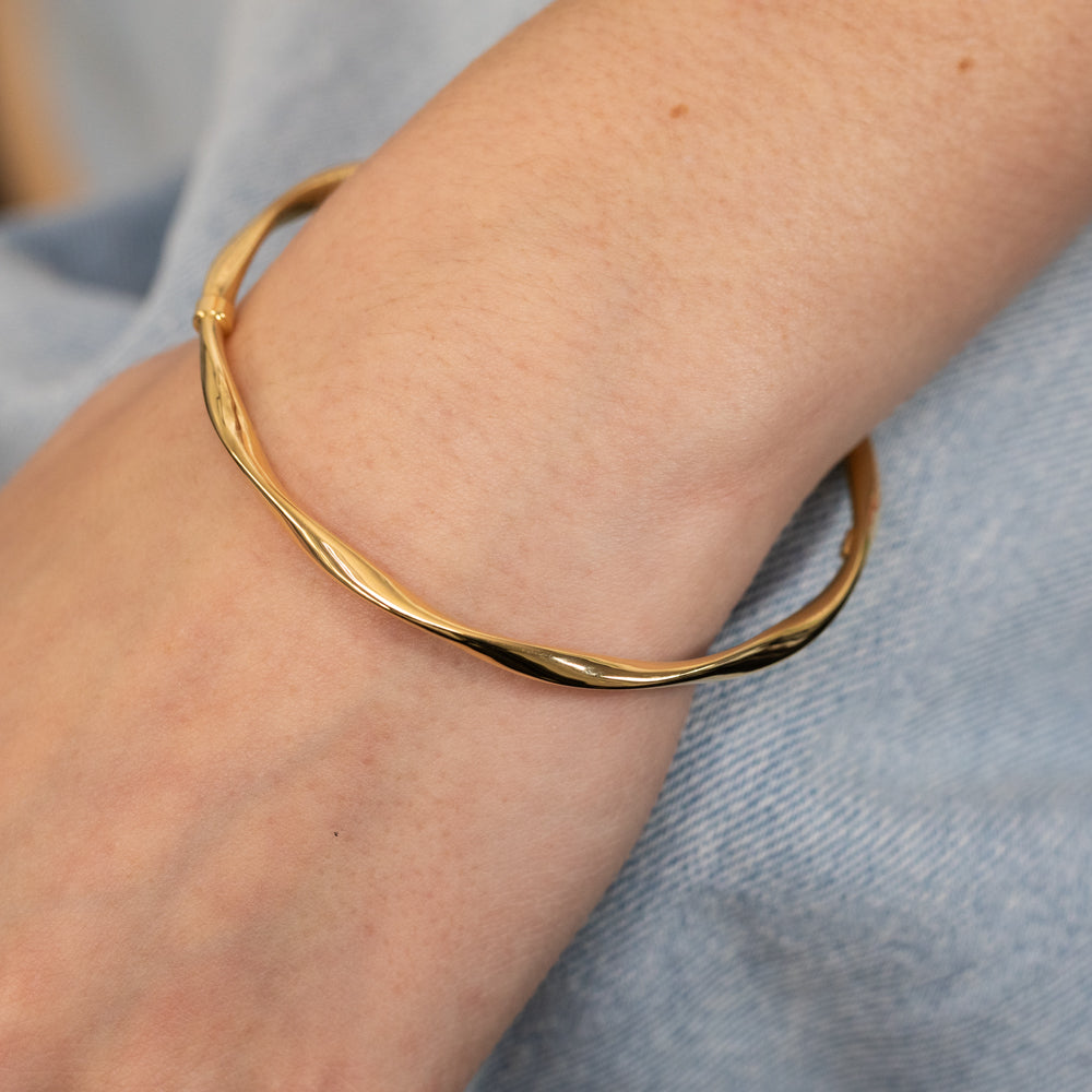 Classic design with a modern twist, there is no going past this stunning 9ct filled bangle in 65mm. Also avaible in Rose Gold and White Gold.