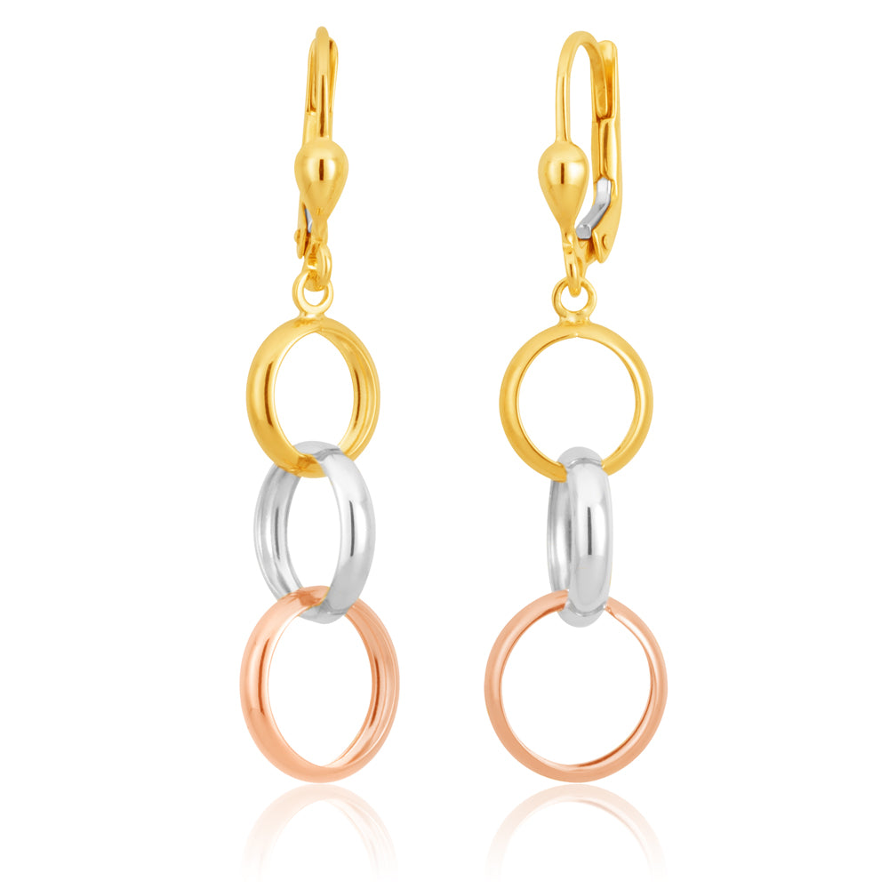 9ct Three Tone Gold Dangling Trio of Hoops Earrings
