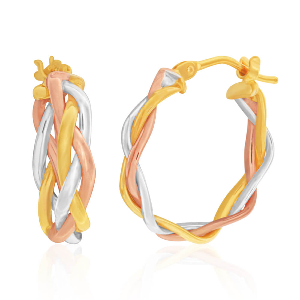 9ct three tone gold fancy braided 3mm x 15mm hoops earrings