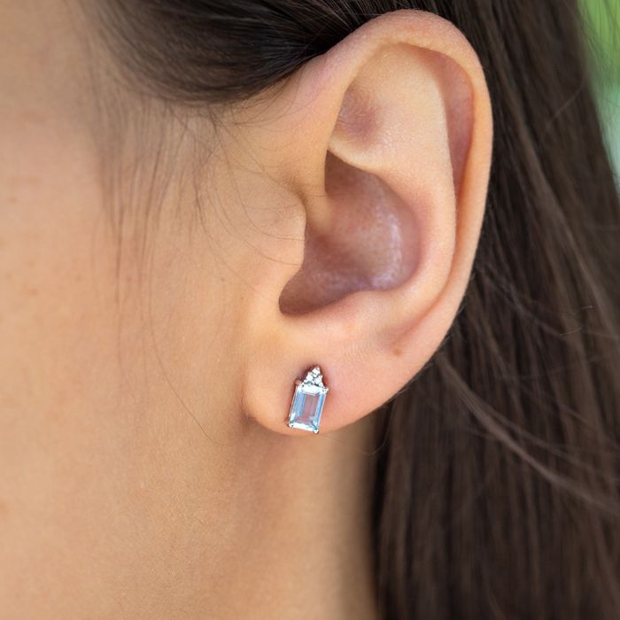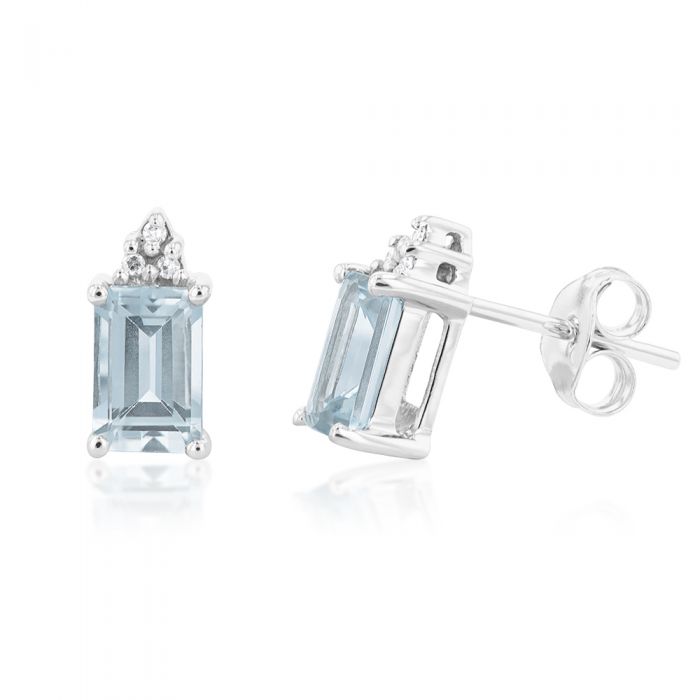 9ct White Gold Aquamarine Emerald Cut and Diamond Stud Earrings