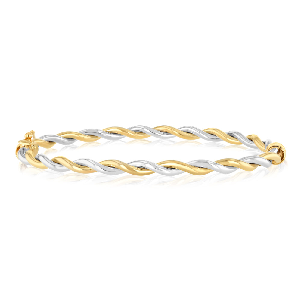 9ct Yellow And White Two Tone Gold Twisted Hinged 60mm Bangle