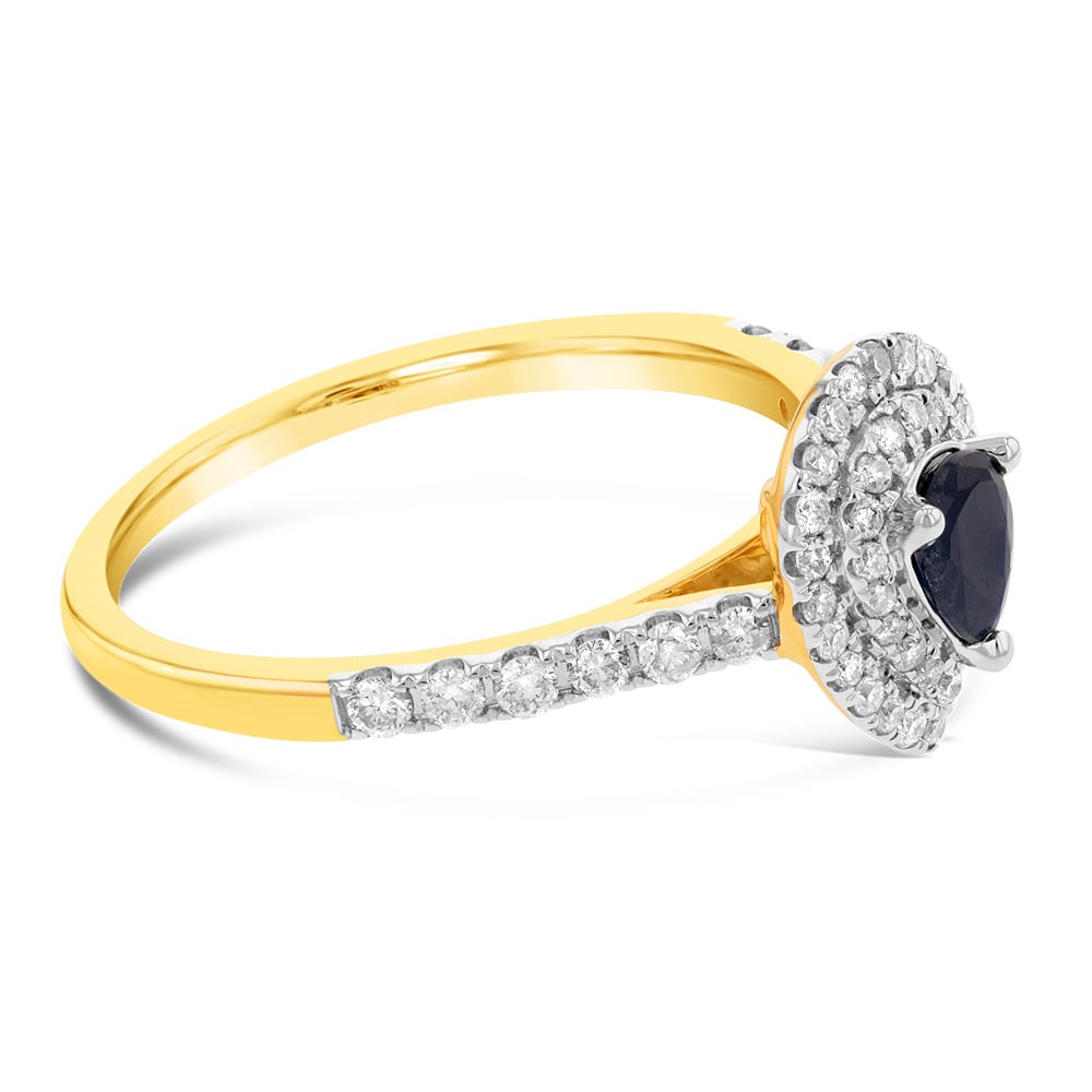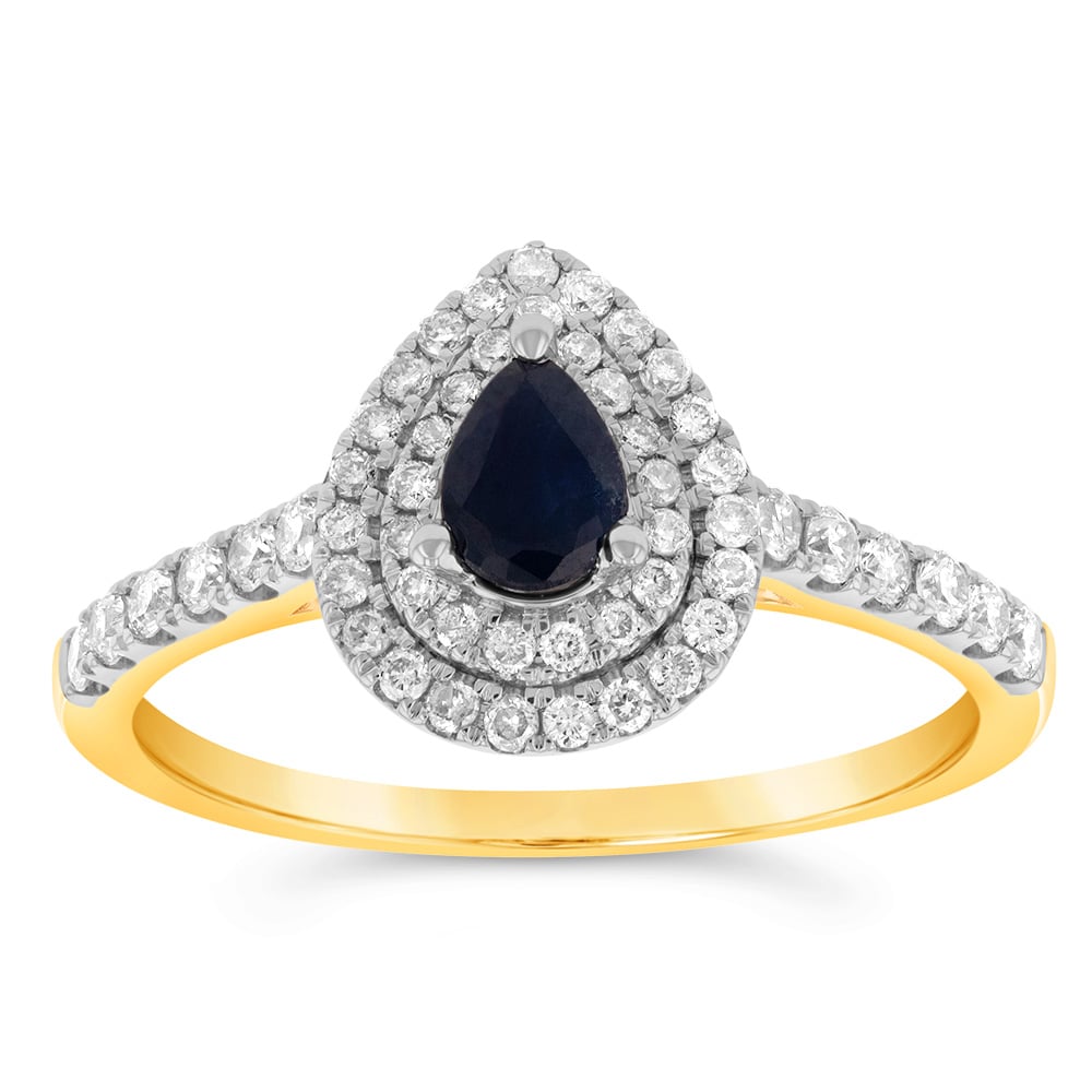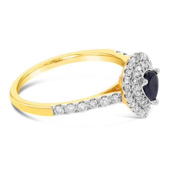 9ct Yellow Gold 0.30ct Natural Black Sapphire and 1/3ct Diamond Double Halo Pear Ring