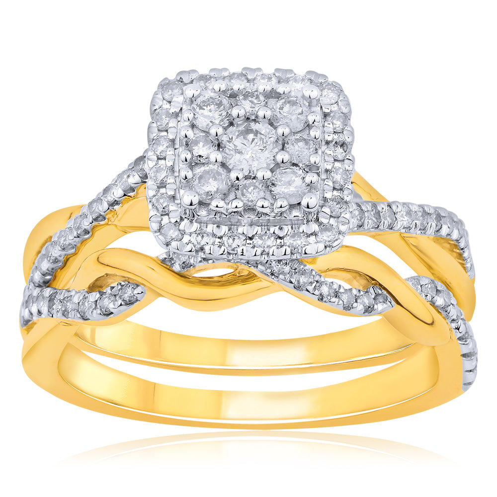 9ct Yellow Gold 1/2 Carat Diamond Bridal Set 2 Rings with Cushion Shape Cluster