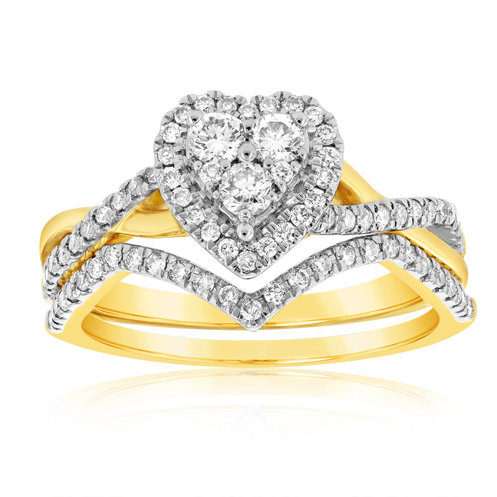 9ct Yellow Gold 1/2 Carat Diamond Bridal 2-Ring Set with Heart Shape Cluster