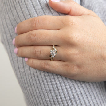 Set with a five-diamond cluster, this 9ct Yellow Gold Diamond Enticing Ring is amazingly unique. The beautiful swirls of yellow gold and graceful and alluring, holding channels of brilliant cut diamonds to accent the main piece. The centre cluster is set in white gold, expressing elegance and lightness. A masterclass of design, this ring is one to cherish proudly.