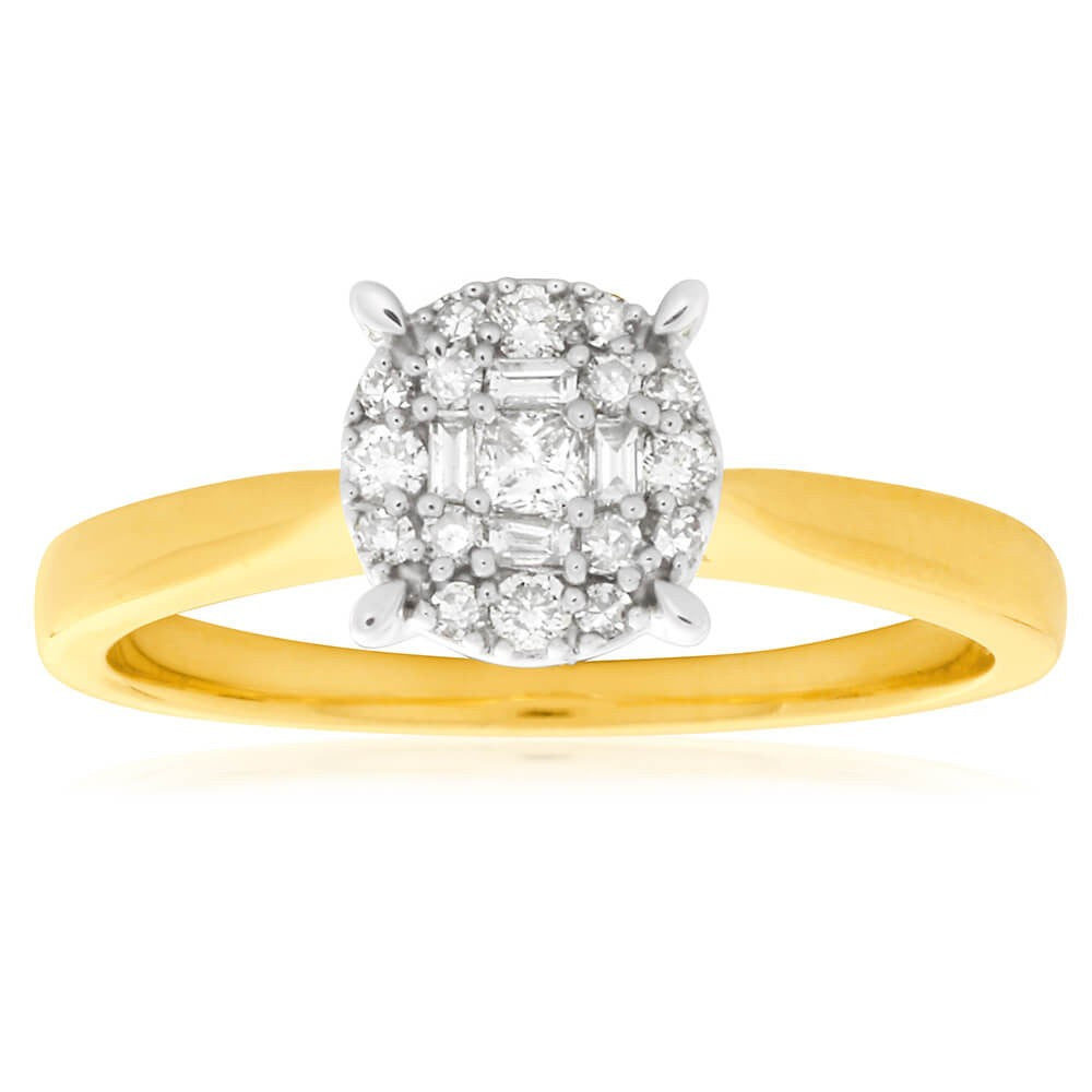 9ct Yellow Gold 1/5 Carat Diamond Ring with Brilliant Princess and Baguette Diamonds