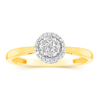 9ct Yellow Gold 1/7 Carat Diamond Cluser Halo Ring