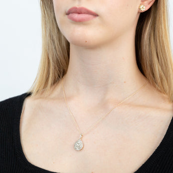 Paired with a lavish 45cm gold chain that sits at a flattering short length. Above the neckline, this diamond pendant brightens your entire look.