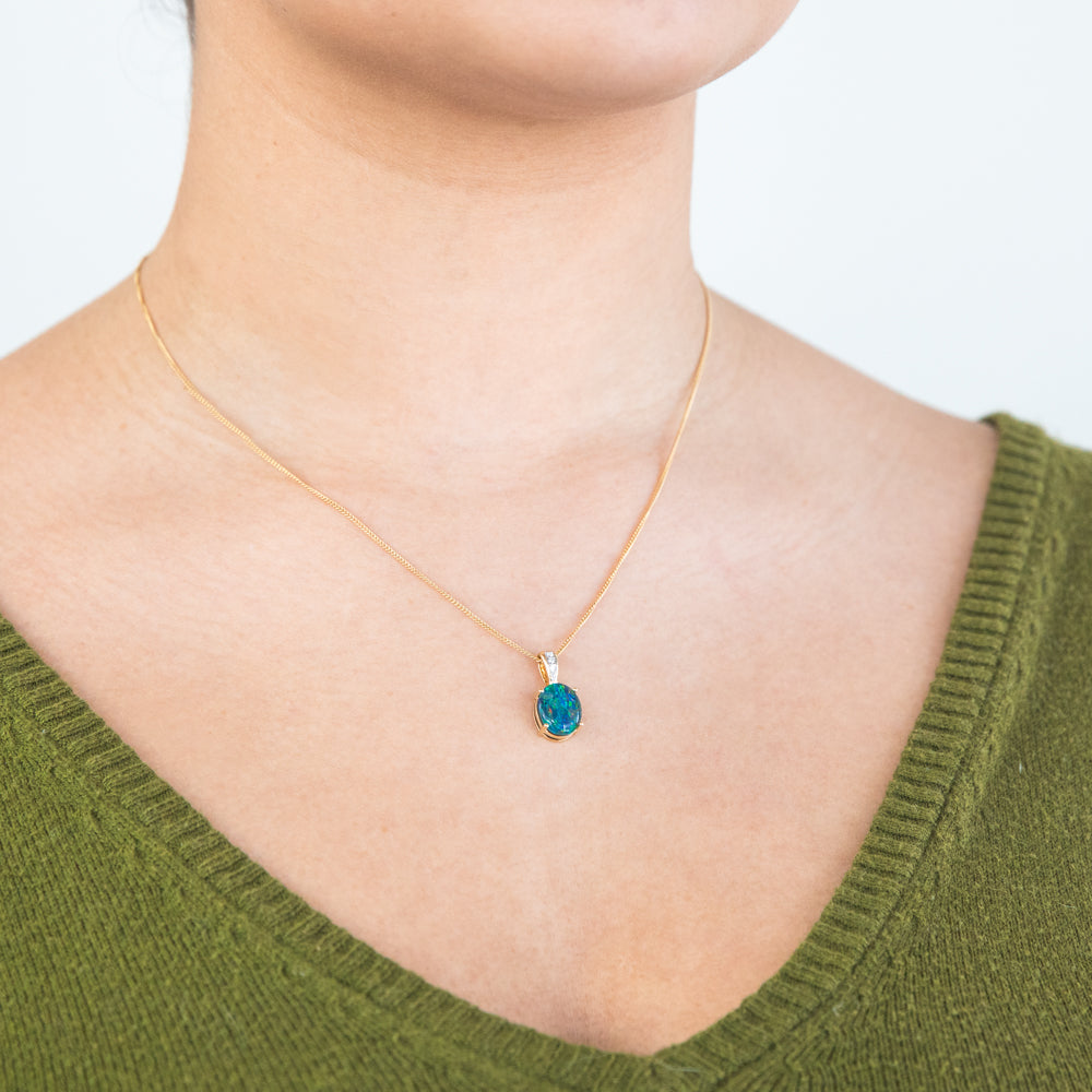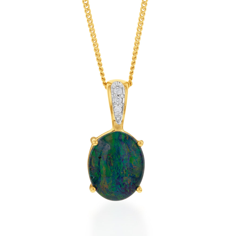 9ct Yellow Gold 11x9mm Oval Opal Diamond Set Pendant