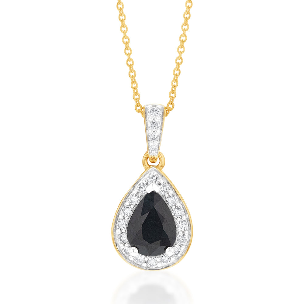 9ct Yellow Gold 1ct Natural Sapphire Pear Halo Pendant with 0.15 Carat Diamond on 45cm Chain