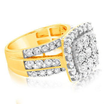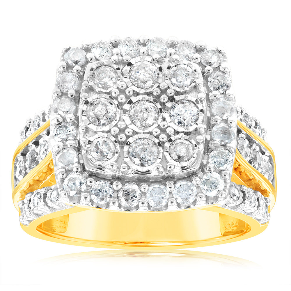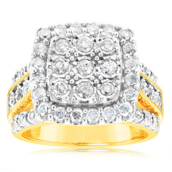9ct Yellow Gold 2 Carat Diamond Cluster Square Dress Ring