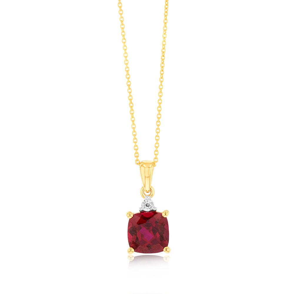 9ct Yellow Gold 2ct Created Ruby and Diamond Pendant On 45cm Chain