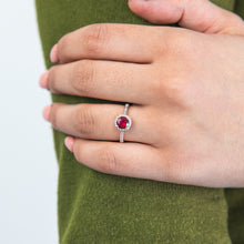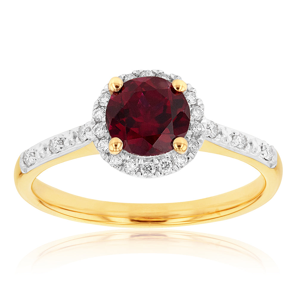 9ct Yellow Gold Created Ruby 1/10 Carat Diamond Halo Ring