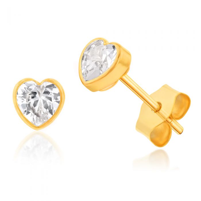 9ct Yellow Gold Bezel Set Heart Shape Cubic Zirconia Stud Earrings