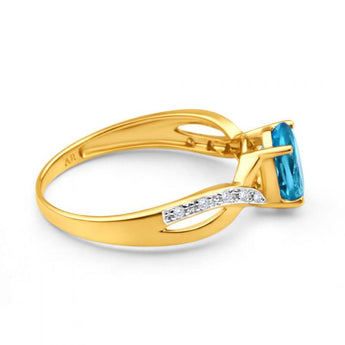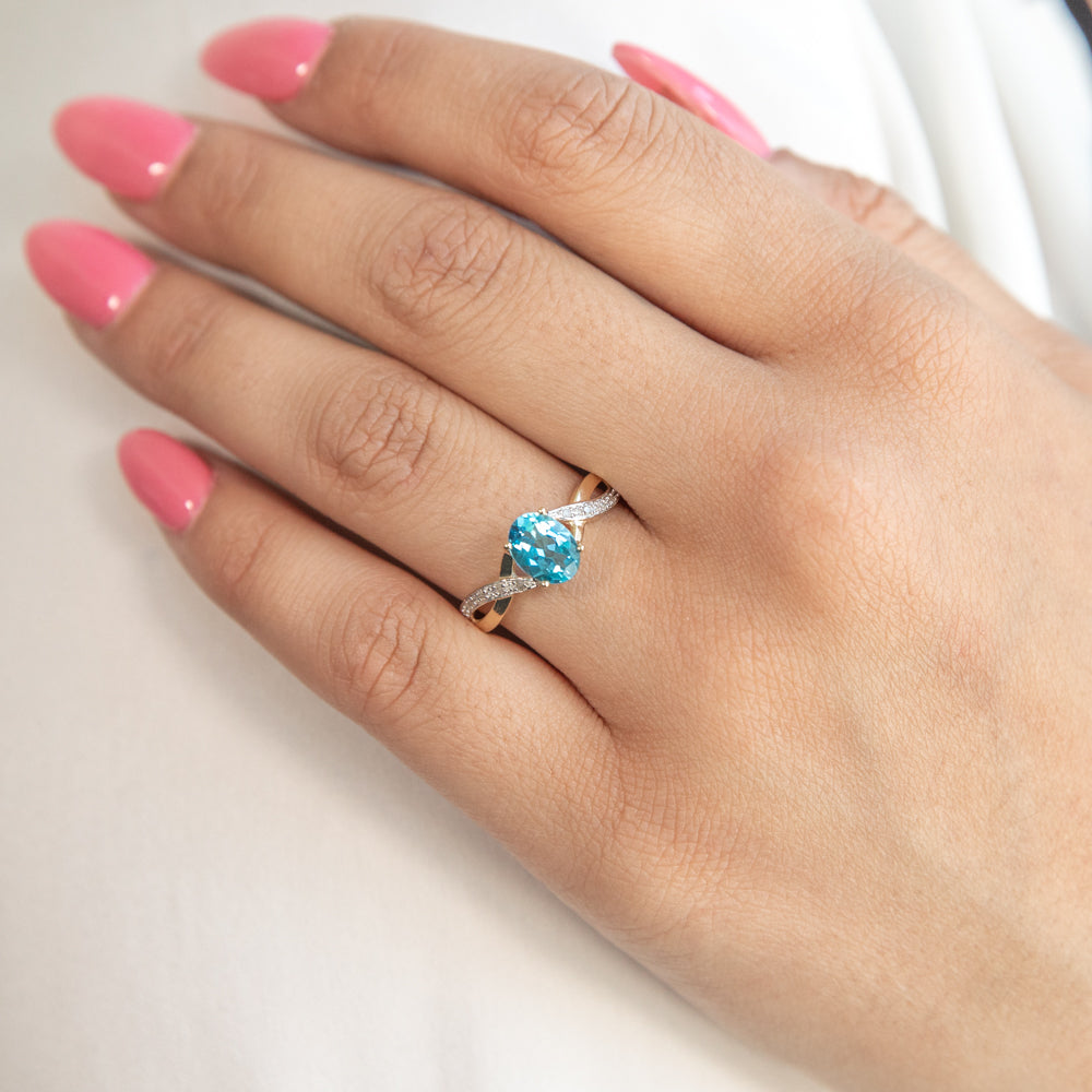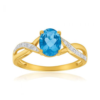 9ct Yellow Gold Blue Topaz and Diamond Cross Over Ring