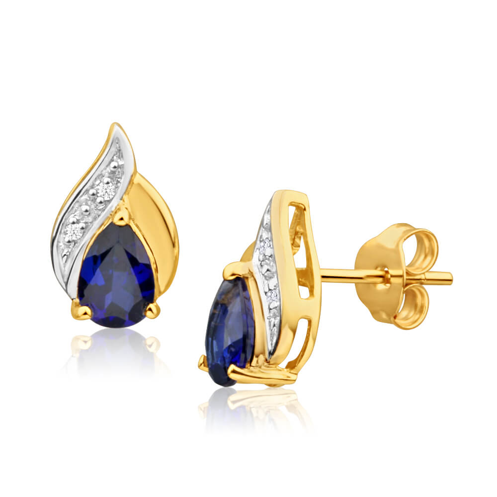 9ct Yellow Gold Created Blue Sapphire + Diamond Stud Earrings