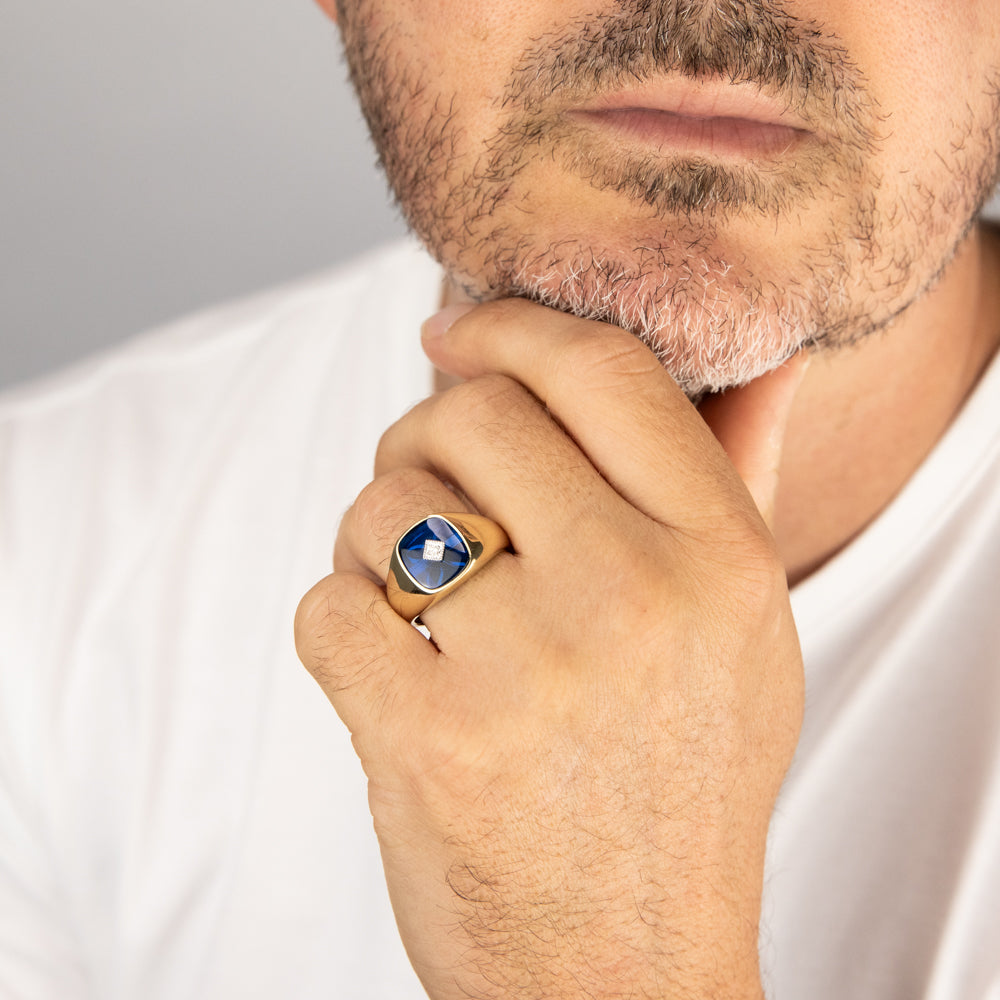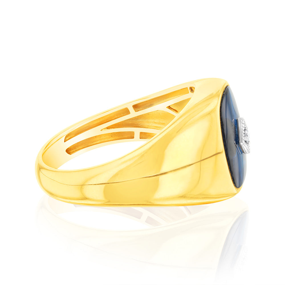 9ct Yellow Gold Created Blue Spinel & Diamond Gents Ring