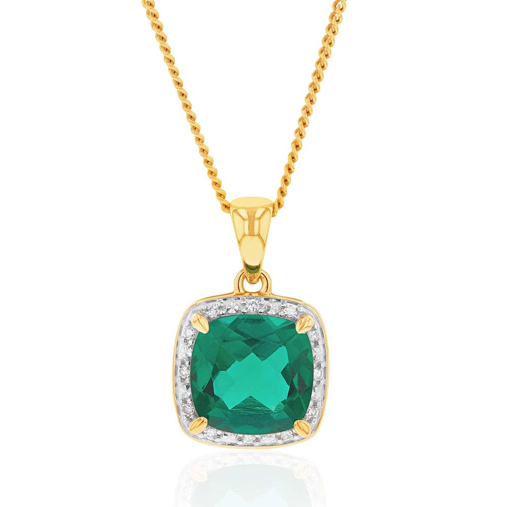 9ct Yellow Gold Created Emerald and Diamond Cushion Cut Pendant