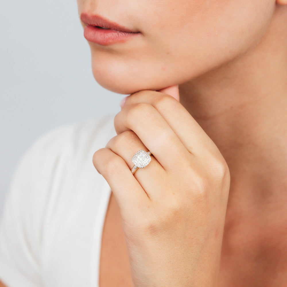 9ct Yellow Gold Cushion Shaped Fancy Ring with 32 Round Brilliant Cut Diamonds