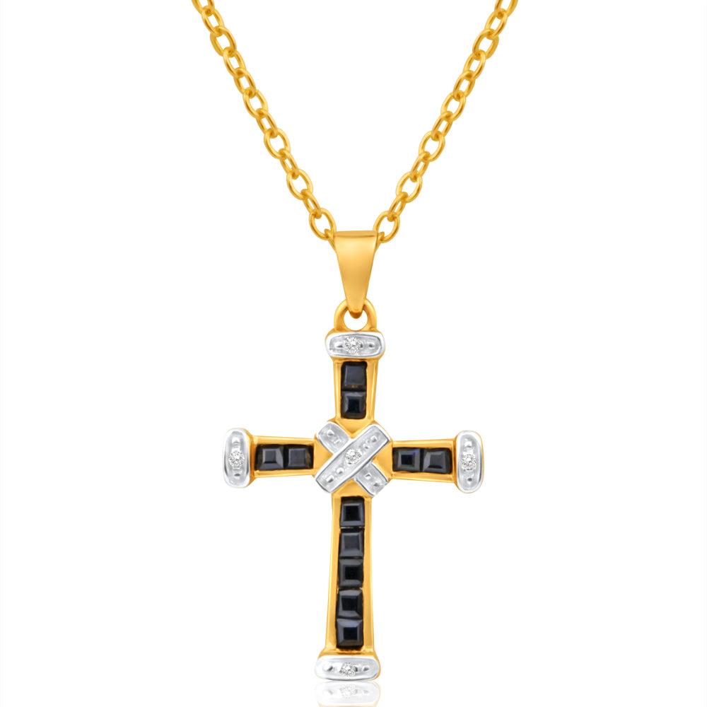 9ct Yellow Gold Dark Sapphire + Diamond Cross Pendant