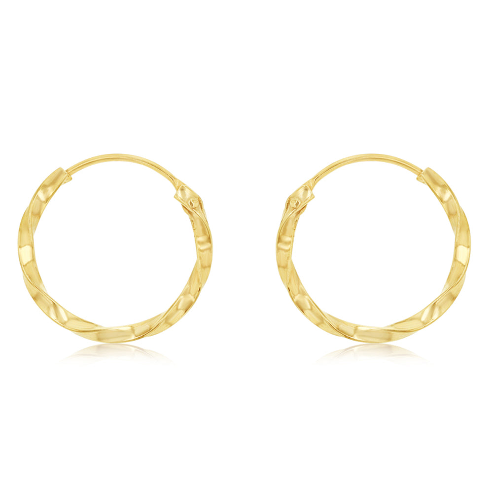 9ct Yellow Gold Diamond Cut Twisted 1.25 x 12mm Sleeper Hoop Earrings