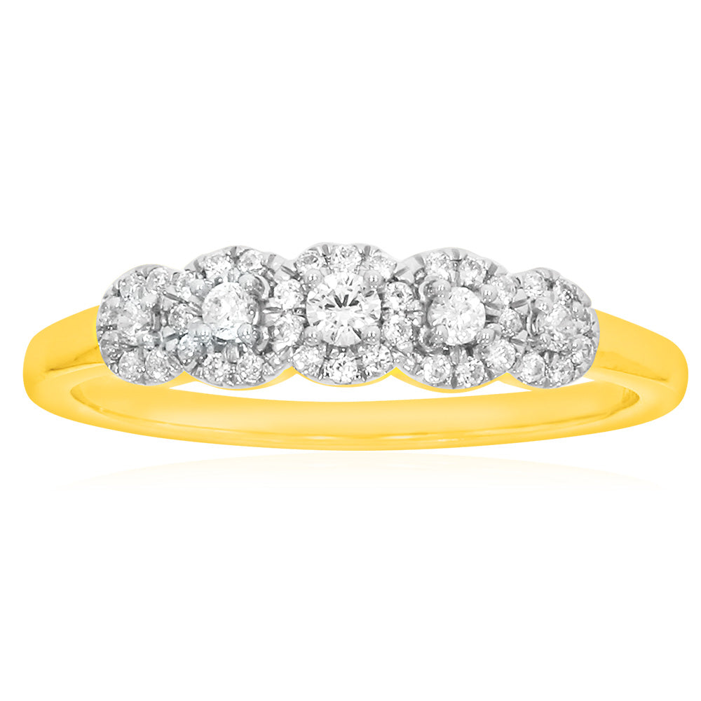 9ct Yellow Gold Diamond Ring with 5 Brilliant Diamonds surrounded by Diamond Halos