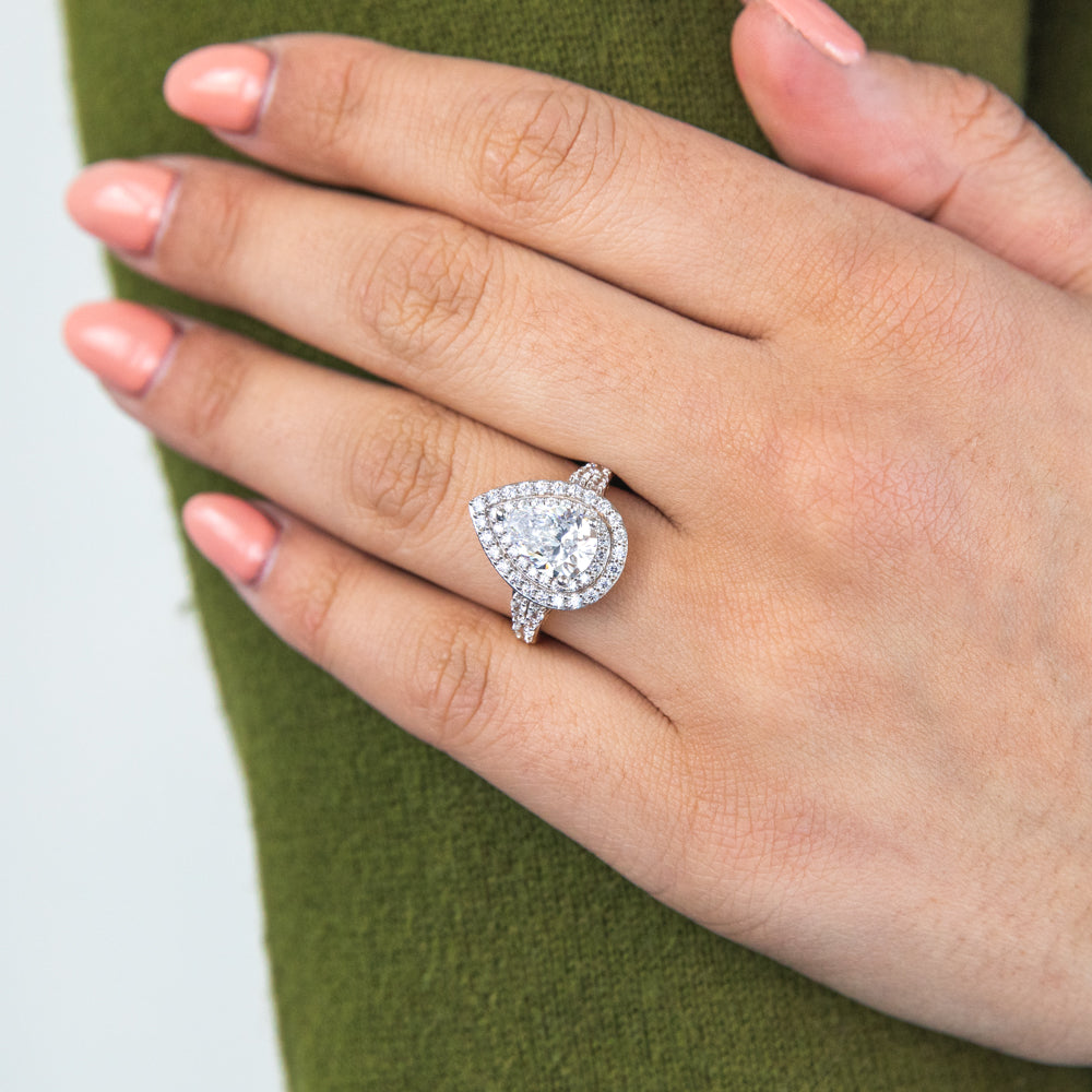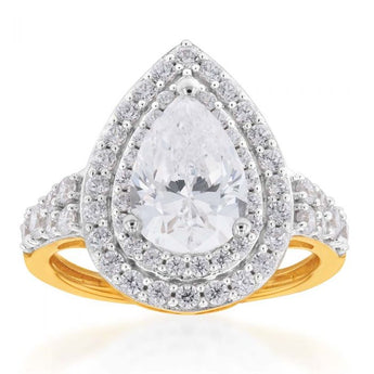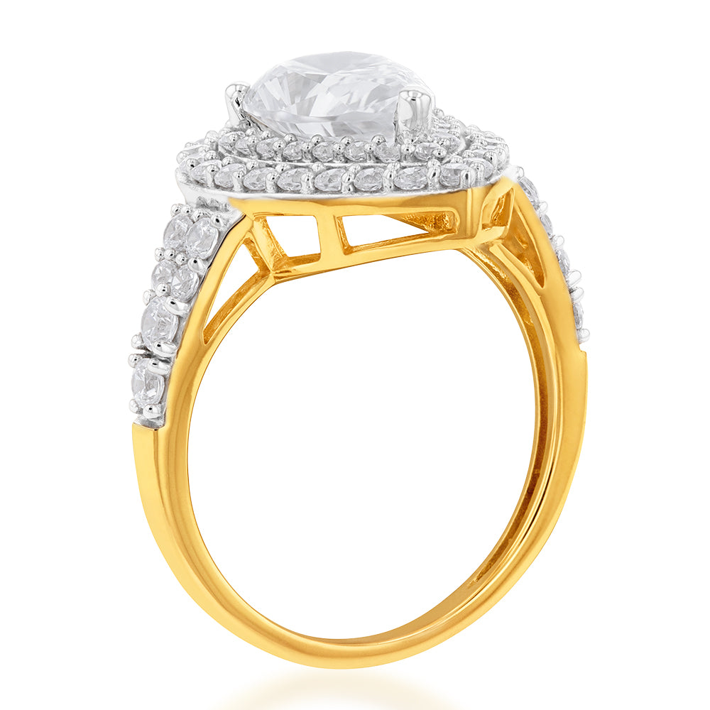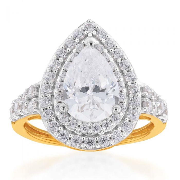 9ct Yellow Gold Double Halo Pear and Channel Zirconia Ring