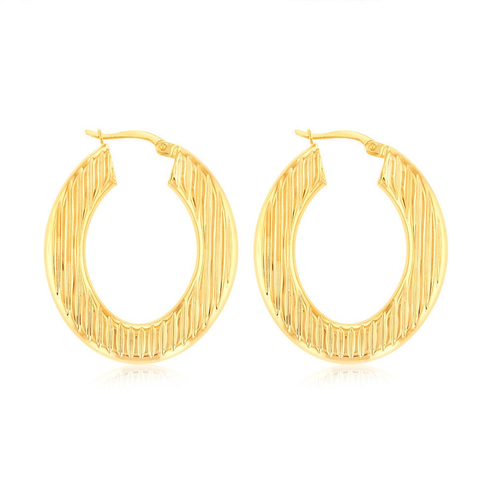 9ct Yellow Gold Double Side Textured Oval Hoop Earrings