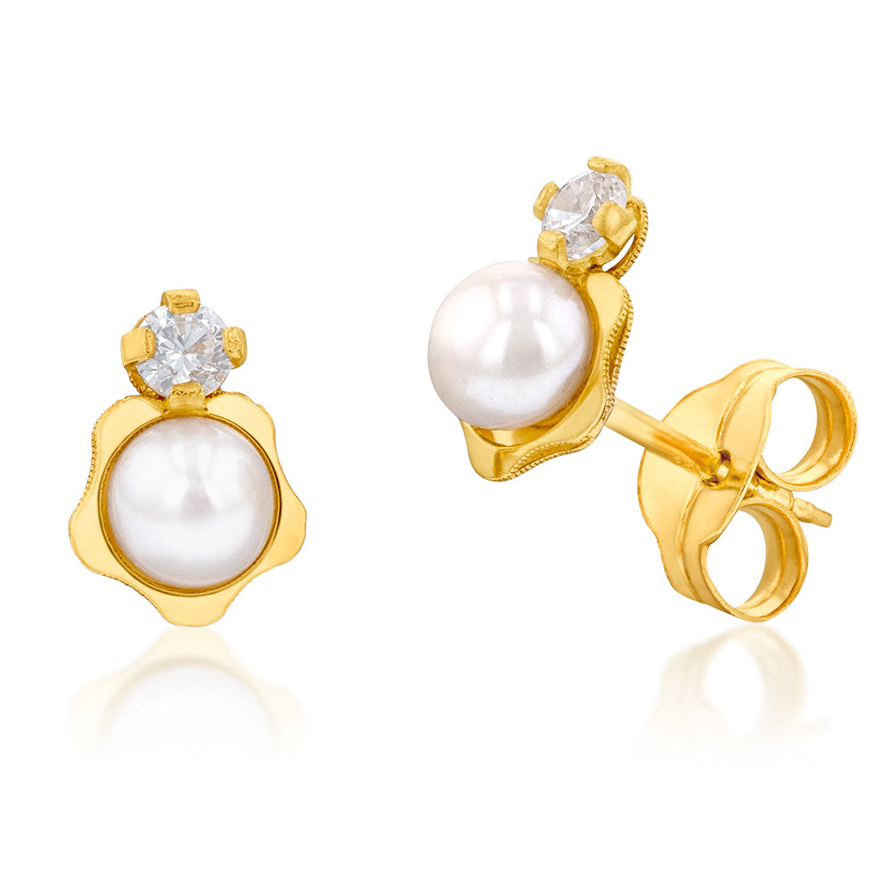 Expressing a luxury look, these 9ct Yellow Gold Freshwater Pearl and Zirconia Studs make a flawless gift for anyone who loves pearls. The glamourous mixture of yellow gold, white zirconia and beautiful freshwater pearl is enough to make any heart melt. The gold settings are finely shaped for an elegant finish.