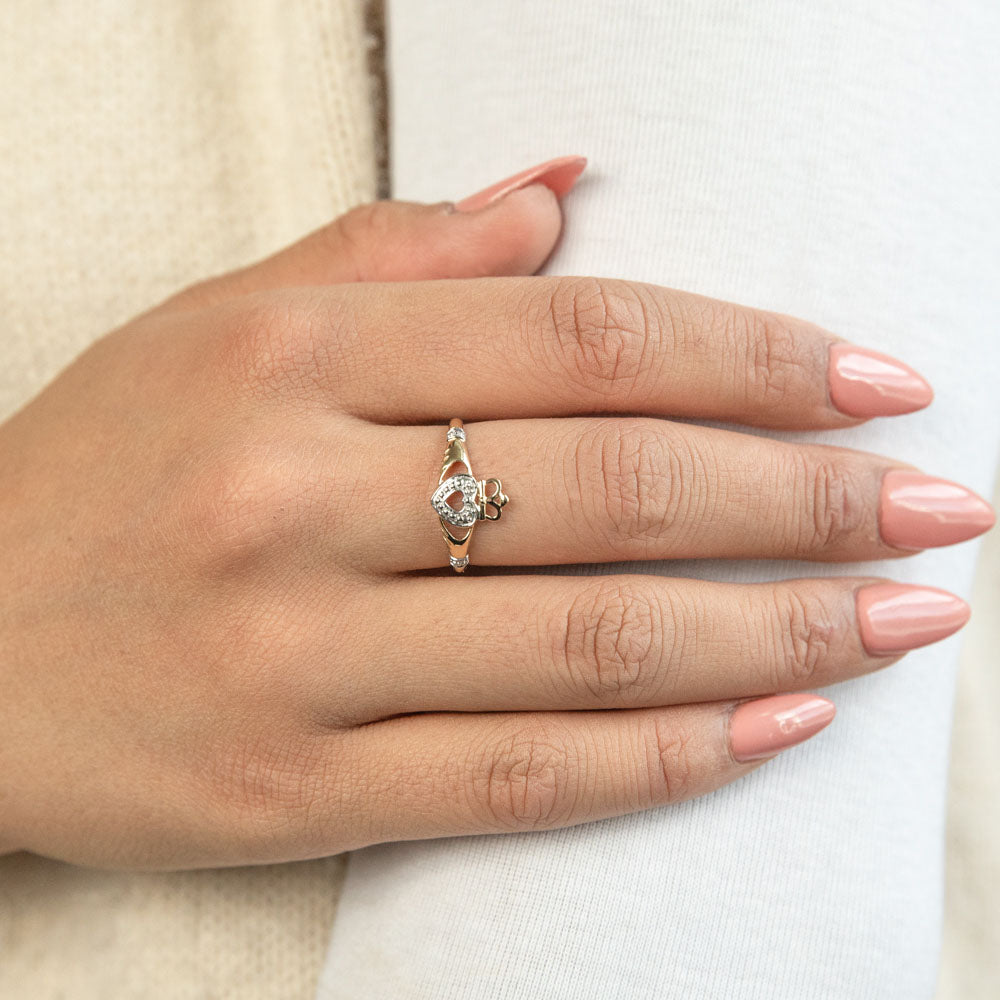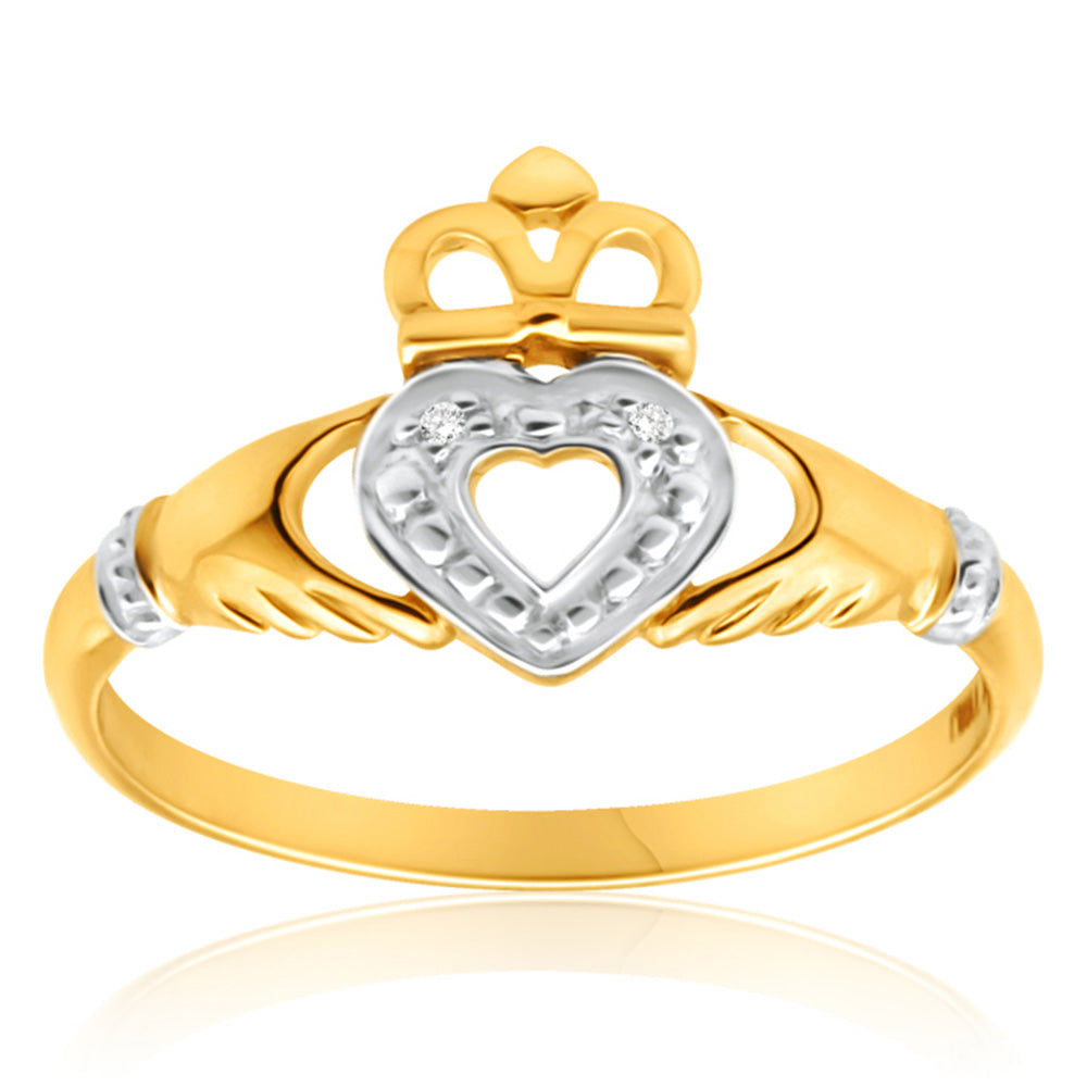 Elevate your style with the enchanting 9ct Yellow Gold Majestic Diamond Ring—a sparkling Claddagh ring that exudes unique charm. Crafted in radiant 9ct yellow gold, this gorgeous piece is designed to make a bold and distinctive statement.